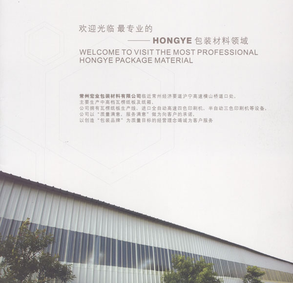常州宏業(yè)包裝材料有限公司從最初的鮮為人知發(fā)展到現(xiàn)今包裝材料行業(yè)的主流品牌之一。公司生產(chǎn)的包裝材料產(chǎn)品不僅在國內已經(jīng)建立了大量的穩(wěn)定的客戶,產(chǎn)品也已遠銷到國外多個國家和地區(qū),深受客戶的好評。 公司臨近常州經(jīng)濟要道滬寧高速橫山道口處,主要生產(chǎn)中高檔瓦楞紙板及紙箱,公司擁有瓦楞紙板生產(chǎn)線、進口全自動高速四色印刷機、半自動三色印刷機等設備,公司以“質量滿意,服務滿意”做為向客戶的承諾,以創(chuàng)造“包裝品牌”為質量目標的經(jīng)營理念竭誠為客戶服務。 公司已通過ISO9001和1400的認證。 宏業(yè)包裝的商業(yè)信條:宏業(yè)相信自己會成功, 宏業(yè)相信自己所銷售的商品 ,宏業(yè)員工相信自己所在的公司 ,宏業(yè)相信自己的員工和客戶,宏業(yè)相信成功并不是賺取金錢,而是創(chuàng)造信譽,只有好的信譽,成功才會有價值,宏業(yè)相信世界上最美好最偉大的詞就是“自信”,宏業(yè)相信自已每做一次銷售,就交上一個朋友。