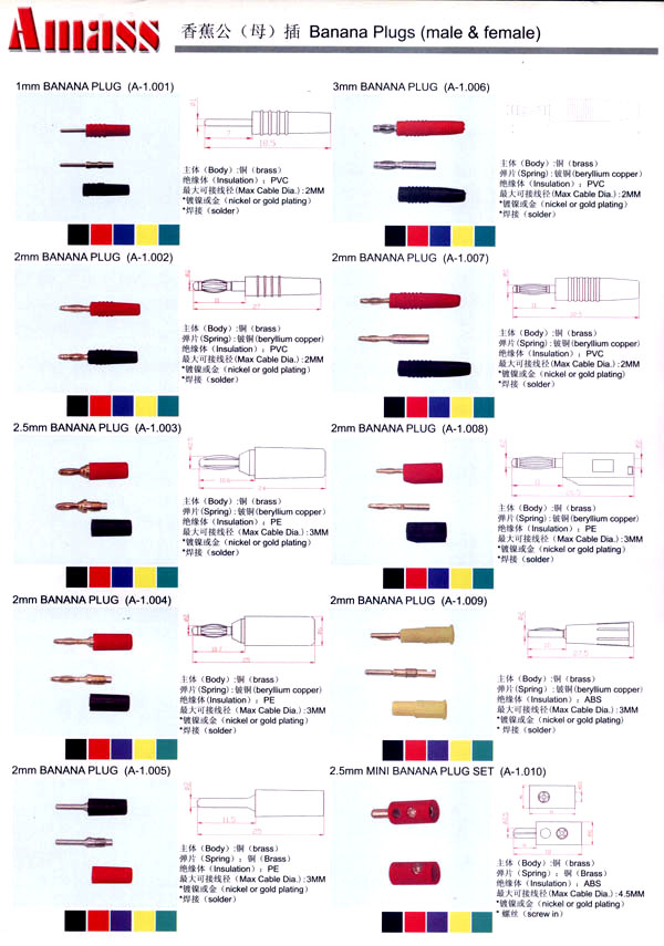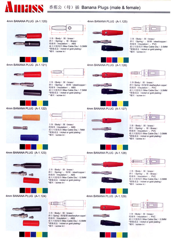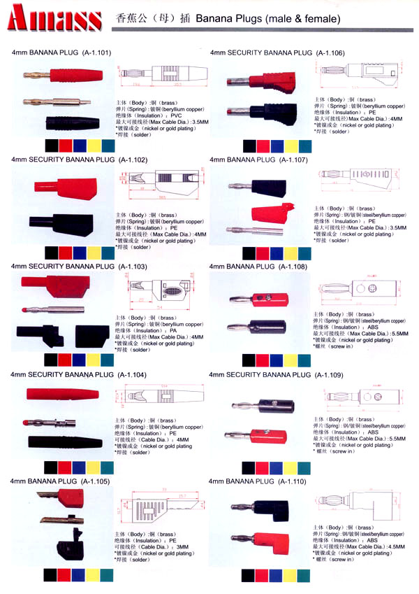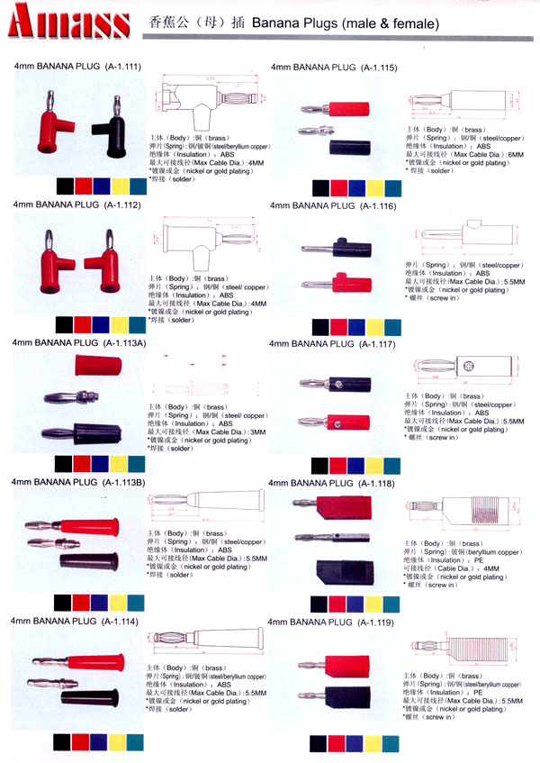 本公司專(zhuān)業(yè)生產(chǎn)各類(lèi)香蕉插頭,香蕉插座,接線柱,電瓶夾,鱷魚(yú)夾,測(cè)試導(dǎo)線,測(cè)試筆等。產(chǎn)品分2mm/2.5mm/3mm/3.5mm/4mm五大系列,百余種款式, 各種香蕉插廣泛用于儀器、儀表、電力測(cè)試、教學(xué)、玩具,視聽(tīng)設(shè)備、醫(yī)療儀器,保健產(chǎn)品等領(lǐng)域。公司技術(shù)力量雄厚,生產(chǎn)工藝先進(jìn),產(chǎn)品遠(yuǎn)銷(xiāo)港、臺(tái)、歐美,并與飛利浦等國(guó)際品牌配套。公司本著精益求精的理念,歡迎新老客戶光臨。 我們擁有資深的工程師和豐富的電子產(chǎn)品銷(xiāo)售經(jīng)驗(yàn),專(zhuān)業(yè)生產(chǎn)各類(lèi)電子接插件產(chǎn)品。 香蕉插頭,香蕉插座,電瓶夾,鱷魚(yú)夾等品種齊全、 質(zhì)量可靠,致力服務(wù)于通訊、數(shù)據(jù)通信、消費(fèi)類(lèi)電子產(chǎn)品、計(jì)算機(jī)和計(jì)算機(jī)外圍設(shè)備以及工業(yè)應(yīng)用等領(lǐng)域,能給客戶提供全面采購(gòu)解決方案。 我們秉承穩(wěn)健作風(fēng)、誠(chéng)實(shí)經(jīng)營(yíng)、合理價(jià)格、完善服務(wù)的宗旨,在全體客戶的支持下,公司不斷創(chuàng)新進(jìn)取,業(yè)績(jī)蒸蒸日上,已與數(shù)十家電子零件制造商及其分支機(jī)構(gòu)建立密切合作關(guān)系,在國(guó)內(nèi)擁有數(shù)百家固定客戶。