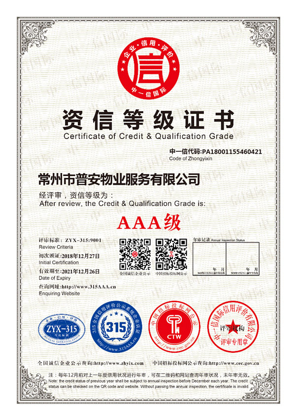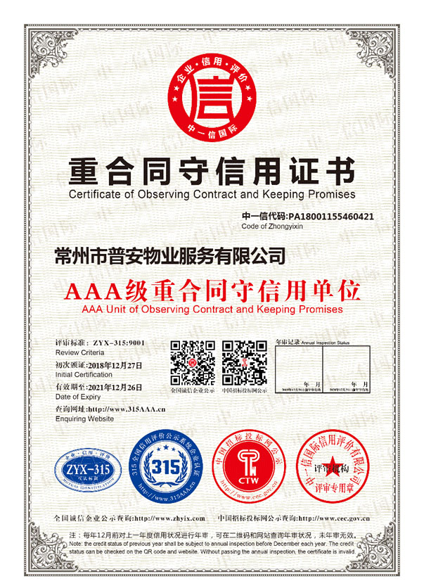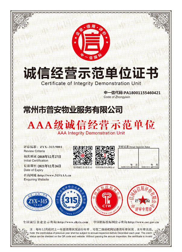 常州市普安物業(yè)服務(wù)有限公司成立于2014年6月,注冊(cè)資金500萬(wàn)元人民幣,原公司名稱“常州市九合物業(yè)服務(wù)有限公司”具有國(guó)家三級(jí)物業(yè)服務(wù)資質(zhì)的物業(yè)管理服務(wù)企業(yè),公司本著“業(yè)主至上、服務(wù)第一,陽(yáng)光服務(wù)、精品管理”的服務(wù)理念,精心打造具有普安物業(yè)特色的專業(yè)管理品牌。