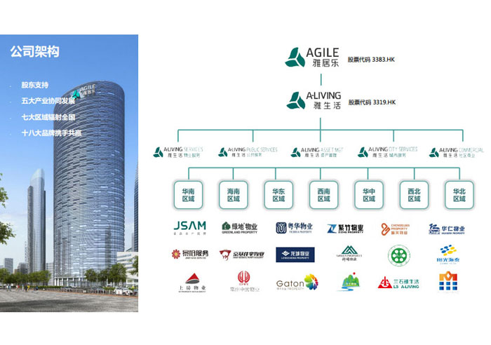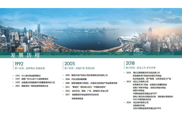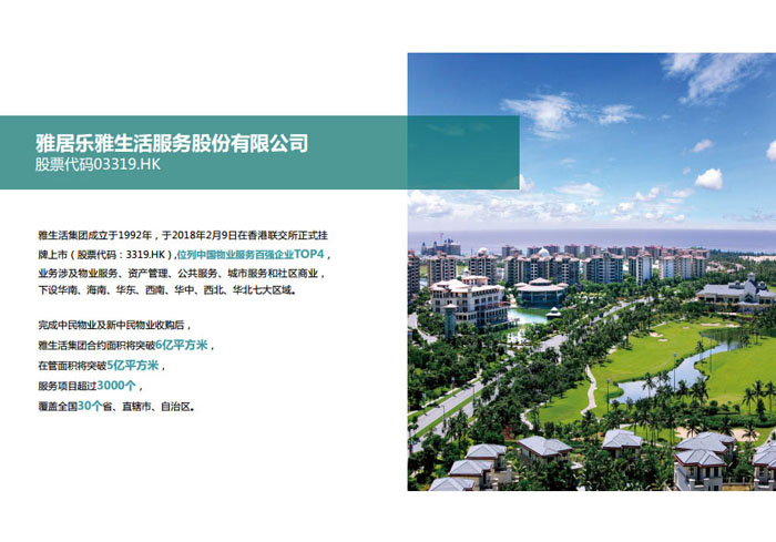 一、立足北上廣,面向全中國,走向全世界 1992年,雅居樂物業(yè)開篇中山,率先引入港式物業(yè)管理模式。1997年,依托雅居樂地產(chǎn)的崛起,連續(xù)接管中山多個(gè)項(xiàng)目,成為高端大盤物業(yè)管理的領(lǐng)跑者。1999年,雅居樂物業(yè)開啟專業(yè)化發(fā)展模式,全面通過英國皇家BSI的ISO9000質(zhì)量管理體系認(rèn)證,2001年成為國家首批一級(jí)物業(yè)管理資質(zhì)企業(yè)。 2002年,隨著廣州雅居樂花園的盛大啟幕,雅居樂物業(yè)邁開向廣州進(jìn)軍的步伐。為尋求更長遠(yuǎn)的發(fā)展,雅居樂積極構(gòu)思上市藍(lán)圖,2005年在香港成功上市。在深耕珠三角城市群的同時(shí),2006年雅居樂物業(yè)揮師北上,正式開啟全國部署戰(zhàn)略。2008年,接管海南清水灣項(xiàng)目,揭開旅游地產(chǎn)物業(yè)管理的新篇章。 接下來近十年里,雅居樂物業(yè)始終保持著最年輕的成長姿態(tài),依托“管理數(shù)字化、服務(wù)專業(yè)化、流程標(biāo)準(zhǔn)化和操作機(jī)械化”的發(fā)展戰(zhàn)略,雅居樂物業(yè)榮膺2018中國物業(yè)服務(wù)百強(qiáng)企業(yè)第11名,2018年中國物業(yè)服務(wù)百強(qiáng)企業(yè)成長性第二名、2018年中國物業(yè)服務(wù)百強(qiáng)服務(wù)質(zhì)量領(lǐng)先企業(yè)、2018年中國物業(yè)服務(wù)百強(qiáng)滿意度領(lǐng)先企業(yè)、2018中國物業(yè)服務(wù)百強(qiáng)經(jīng)營績效領(lǐng)先企業(yè)、旅游地產(chǎn)物業(yè)管理領(lǐng)先品牌、2018年中國辦公物業(yè)管理優(yōu)秀企業(yè)(綠地物業(yè))、2017中國物業(yè)管理企業(yè)品牌價(jià)值第12名、2017中國物業(yè)管理企業(yè)綜合實(shí)力第12名、中國藍(lán)籌物業(yè)企業(yè)、《旅游地產(chǎn)物業(yè)管理服務(wù)標(biāo)準(zhǔn)》(團(tuán)體標(biāo)準(zhǔn))起草工作等多項(xiàng)殊榮。 目前,雅生活集團(tuán)已形成廣州、中山、深圳、南京、上海、西安、成都、海南、云南、北京、鄭州、南寧、沈陽、武漢、馬來西亞十五大城市公司全面發(fā)展的蓬勃態(tài)勢(shì)。截止2017年12月31日,雅生活集團(tuán)管理范圍覆蓋全國逾69座城市與地區(qū),服務(wù)類型涵蓋主流住宅、高端豪宅、旅游地產(chǎn)、商業(yè)、寫字樓等多種業(yè)態(tài),合約總建筑面積為12610萬平方米,擁有200多個(gè)項(xiàng)目,服務(wù)業(yè)主逾100萬人。 2017年6月,雅生活集團(tuán)收購綠地物業(yè)100%股權(quán),并與綠地集團(tuán)簽署戰(zhàn)略合作協(xié)議,8月,綠地集團(tuán)投資10億元獲得雅生活集團(tuán)20%股權(quán)。未來,雅生活集團(tuán)將實(shí)施“雅居樂物業(yè)”與“綠地物業(yè)”雙品牌驅(qū)動(dòng)戰(zhàn)略,還將尋求在A股上市,力爭打造中國物業(yè)“A+H”第一股。