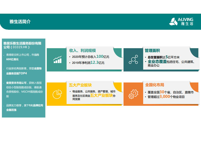 “人是雅居樂關(guān)注的核心,雅居樂不僅要蓋好房子,更希望全方位呵護(hù)業(yè)主的一生! 2015年,雅居樂集團(tuán)重新定義社區(qū)服務(wù)理念,以聯(lián)動(dòng)發(fā)展模式,整合最優(yōu)質(zhì)的社區(qū)資源,為業(yè)主提供全面的居家生活解決方案。因此,雅居樂集團(tuán)“1+N”多元發(fā)展戰(zhàn)略規(guī)劃下的首個(gè)產(chǎn)業(yè)集團(tuán)——雅生活集團(tuán)應(yīng)運(yùn)而生。目前雅生活集團(tuán)已集結(jié)物業(yè)、科技、旅游、廣告、營銷、驗(yàn)房六大業(yè)務(wù)艦隊(duì)。2018年2月9日,雅生活集團(tuán)正式在香港聯(lián)合交易所主板掛牌上市(股票代碼03319.HK),成為中國首家紅籌分拆H股的物業(yè)服務(wù)企業(yè)。