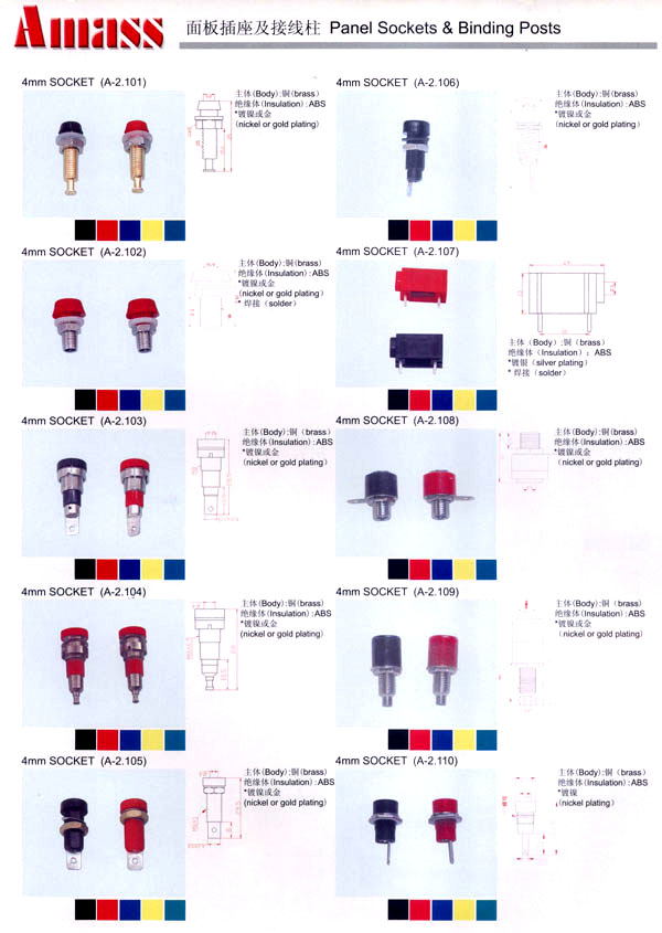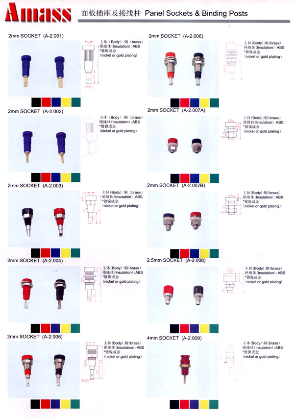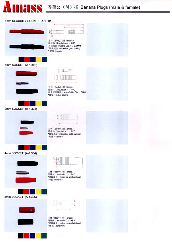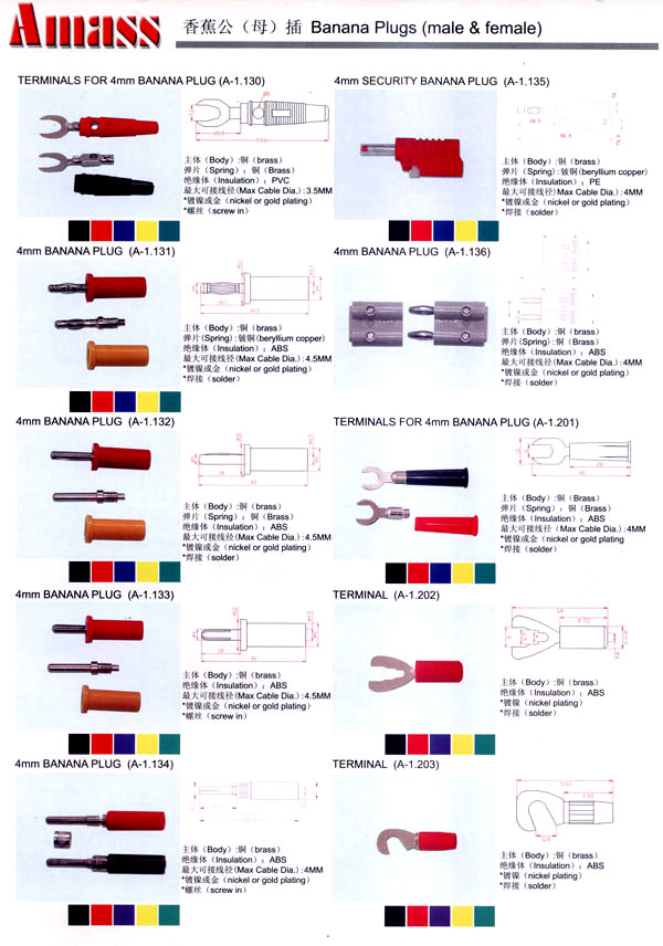 本公司專業(yè)生產(chǎn)各類香蕉插頭,香蕉插座,接線柱,電瓶夾,鱷魚夾,測試導(dǎo)線,測試筆等。產(chǎn)品分2mm/2.5mm/3mm/3.5mm/4mm五大系列,百余種款式, 各種香蕉插廣泛用于儀器、儀表、電力測試、教學(xué)、玩具,視聽設(shè)備、醫(yī)療儀器,保健產(chǎn)品等領(lǐng)域。公司技術(shù)力量雄厚,生產(chǎn)工藝先進(jìn),產(chǎn)品遠(yuǎn)銷港、臺、歐美,并與飛利浦等國際品牌配套。公司本著精益求精的理念,歡迎新老客戶光臨。 我們擁有資深的工程師和豐富的電子產(chǎn)品銷售經(jīng)驗,專業(yè)生產(chǎn)各類電子接插件產(chǎn)品。 香蕉插頭,香蕉插座,電瓶夾,鱷魚夾等品種齊全、 質(zhì)量可靠,致力服務(wù)于通訊、數(shù)據(jù)通信、消費類電子產(chǎn)品、計算機(jī)和計算機(jī)外圍設(shè)備以及工業(yè)應(yīng)用等領(lǐng)域,能給客戶提供全面采購解決方案。 我們秉承穩(wěn)健作風(fēng)、誠實經(jīng)營、合理價格、完善服務(wù)的宗旨,在全體客戶的支持下,公司不斷創(chuàng)新進(jìn)取,業(yè)績蒸蒸日上,已與數(shù)十家電子零件制造商及其分支機(jī)構(gòu)建立密切合作關(guān)系,在國內(nèi)擁有數(shù)百家固定客戶。