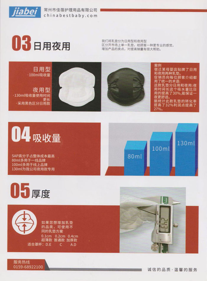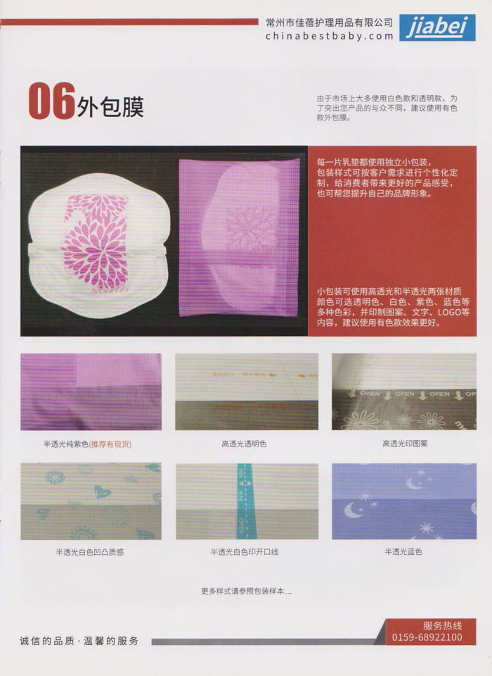 常州市佳蓓護(hù)理用品有限公司是一家專業(yè)從事開發(fā)、生產(chǎn)、銷售并具備自營出口的外向型企業(yè),主要生產(chǎn)“一次性防溢乳墊“,以質(zhì)量穩(wěn)定,柔軟親膚而深受客戶和消費(fèi)者青睞。本公司產(chǎn)品從生產(chǎn)到包裝成品嚴(yán)格執(zhí)行無菌生產(chǎn)標(biāo)準(zhǔn)化流程,并和設(shè)備生產(chǎn)廠家合作開發(fā)了兩條從進(jìn)料、生產(chǎn)、檢測、滅菌、成品包裝的無菌生產(chǎn)線,從而實(shí)現(xiàn)了真正意義上的無菌生產(chǎn)標(biāo)準(zhǔn)化。 佳蓓秉承”用戶至上“的原則,期待與國內(nèi)外客戶真誠合作,同時(shí)也誠邀品牌公司貼牌合作,歡迎您的蒞臨和指導(dǎo),與我們攜手合作,共創(chuàng)未來。