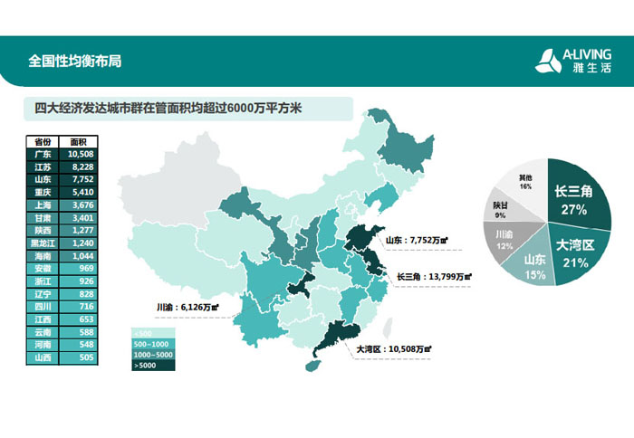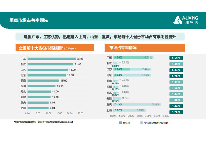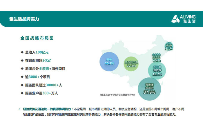 一、立足北上廣,面向全中國,走向全世界 1992年,雅居樂物業(yè)開篇中山,率先引入港式物業(yè)管理模式。1997年,依托雅居樂地產(chǎn)的崛起,連續(xù)接管中山多個項(xiàng)目,成為高端大盤物業(yè)管理的領(lǐng)跑者。1999年,雅居樂物業(yè)開啟專業(yè)化發(fā)展模式,全面通過英國皇家BSI的ISO9000質(zhì)量管理體系認(rèn)證,2001年成為國家首批一級物業(yè)管理資質(zhì)企業(yè)。 2002年,隨著廣州雅居樂花園的盛大啟幕,雅居樂物業(yè)邁開向廣州進(jìn)軍的步伐。為尋求更長遠(yuǎn)的發(fā)展,雅居樂積極構(gòu)思上市藍(lán)圖,2005年在香港成功上市。在深耕珠三角城市群的同時,2006年雅居樂物業(yè)揮師北上,正式開啟全國部署戰(zhàn)略。2008年,接管海南清水灣項(xiàng)目,揭開旅游地產(chǎn)物業(yè)管理的新篇章。 接下來近十年里,雅居樂物業(yè)始終保持著最年輕的成長姿態(tài),依托“管理數(shù)字化、服務(wù)專業(yè)化、流程標(biāo)準(zhǔn)化和操作機(jī)械化”的發(fā)展戰(zhàn)略,雅居樂物業(yè)榮膺2018中國物業(yè)服務(wù)百強(qiáng)企業(yè)第11名,2018年中國物業(yè)服務(wù)百強(qiáng)企業(yè)成長性第二名、2018年中國物業(yè)服務(wù)百強(qiáng)服務(wù)質(zhì)量領(lǐng)先企業(yè)、2018年中國物業(yè)服務(wù)百強(qiáng)滿意度領(lǐng)先企業(yè)、2018中國物業(yè)服務(wù)百強(qiáng)經(jīng)營績效領(lǐng)先企業(yè)、旅游地產(chǎn)物業(yè)管理領(lǐng)先品牌、2018年中國辦公物業(yè)管理優(yōu)秀企業(yè)(綠地物業(yè))、2017中國物業(yè)管理企業(yè)品牌價值第12名、2017中國物業(yè)管理企業(yè)綜合實(shí)力第12名、中國藍(lán)籌物業(yè)企業(yè)、《旅游地產(chǎn)物業(yè)管理服務(wù)標(biāo)準(zhǔn)》(團(tuán)體標(biāo)準(zhǔn))起草工作等多項(xiàng)殊榮。 目前,雅生活集團(tuán)已形成廣州、中山、深圳、南京、上海、西安、成都、海南、云南、北京、鄭州、南寧、沈陽、武漢、馬來西亞十五大城市公司全面發(fā)展的蓬勃態(tài)勢。截止2017年12月31日,雅生活集團(tuán)管理范圍覆蓋全國逾69座城市與地區(qū),服務(wù)類型涵蓋主流住宅、高端豪宅、旅游地產(chǎn)、商業(yè)、寫字樓等多種業(yè)態(tài),合約總建筑面積為12610萬平方米,擁有200多個項(xiàng)目,服務(wù)業(yè)主逾100萬人。 2017年6月,雅生活集團(tuán)收購綠地物業(yè)100%股權(quán),并與綠地集團(tuán)簽署戰(zhàn)略合作協(xié)議,8月,綠地集團(tuán)投資10億元獲得雅生活集團(tuán)20%股權(quán)。未來,雅生活集團(tuán)將實(shí)施“雅居樂物業(yè)”與“綠地物業(yè)”雙品牌驅(qū)動戰(zhàn)略,還將尋求在A股上市,力爭打造中國物業(yè)“A+H”第一股。