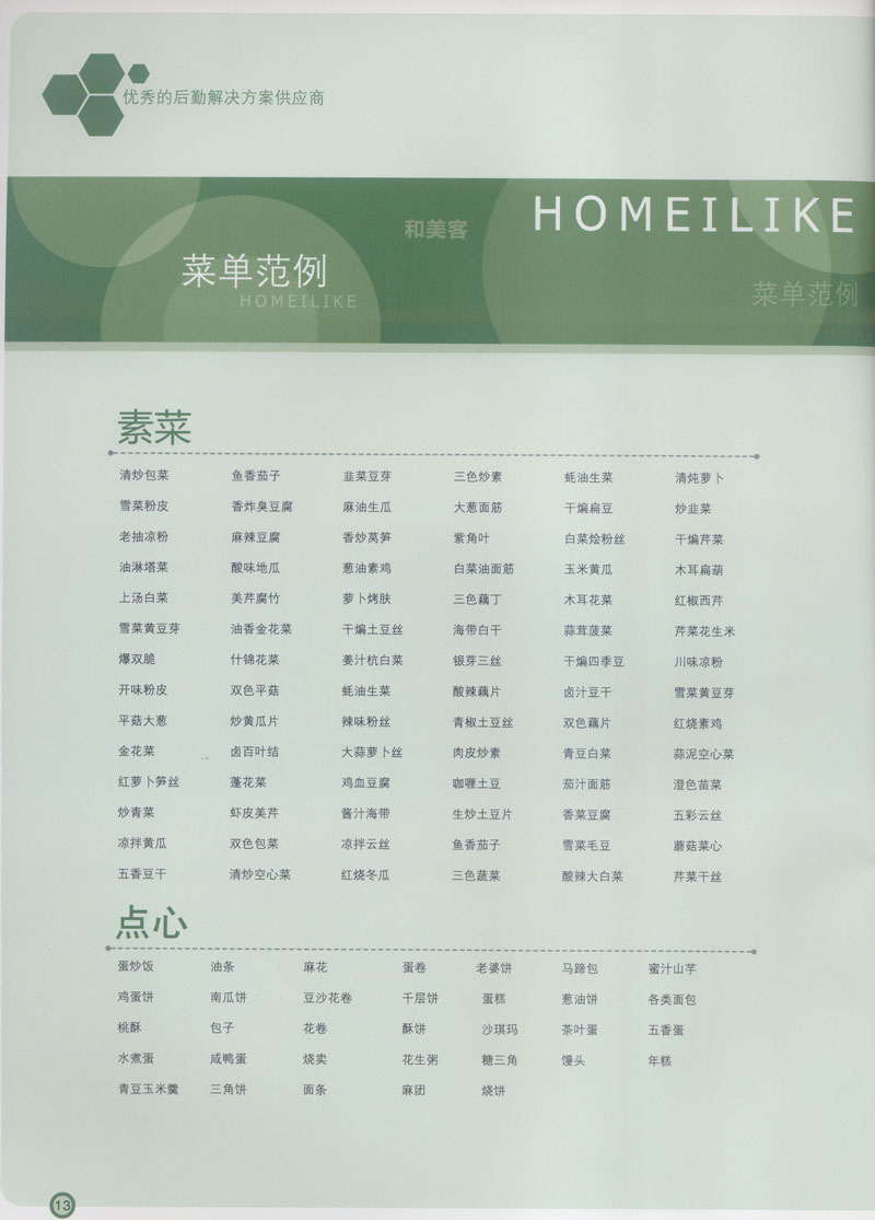常州市思味特餐飲有限公司是一家專業(yè)從事企事業(yè)后勤服務(wù)的有限責(zé)任公司,公司從承包食堂起步,逐漸發(fā)展為經(jīng)營團(tuán)膳承包、營養(yǎng)送餐、生活區(qū)管理、連鎖餐廳的綜合型企業(yè)。2008年公司斥資100萬元,在常州興建了可以同時提供3000餐膳食的中央廚房,重點(diǎn)打造“和美客”后勤服務(wù)品牌,全力為企事業(yè)單位解決后勤后顧之憂。 到目前為止,我們合作成功的企事業(yè)單位超過50多家,服務(wù)人數(shù)突破15萬,合作單位包括國家機(jī)關(guān)、國有企業(yè)、三資企業(yè)、民營企業(yè)、學(xué)校、醫(yī)院等,其中不乏國際知名品牌公司。 和美客愿為更多的國內(nèi)外企事業(yè)單位及機(jī)關(guān)團(tuán)體分憂解難,從廚房設(shè)計(jì)、菜品配送、團(tuán)膳承包、到生活區(qū)管理等提供全方位的服務(wù)。