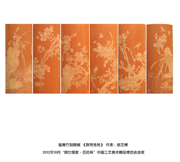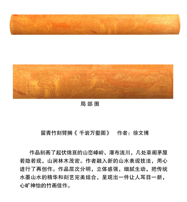 徐博(藝名文博),1973年生,江蘇武進(jìn)人,江蘇省省名人,高級工藝美術(shù)師,常州市留青竹刻非遺傳承人,常州工藝美術(shù)家協(xié)會理事,被譽為當(dāng)今中國最具創(chuàng)新意識的新銳竹刻家代表,多次獲得國家工藝美術(shù)大獎?釔哿羟嘀窨痰男煳牟┵p竹為樂,以竹詠志,借竹抒懷,悉心探索留青竹刻的藝術(shù)表現(xiàn)。在中國工藝美術(shù)大師蕭劍波的精心指導(dǎo)下,開創(chuàng)留青水墨山水之技法,更好的體現(xiàn)了竹刻淡雅清秀的藝術(shù)風(fēng)格,并不斷汲取書畫、攝影、雕塑等藝術(shù)精華,不斷滋養(yǎng)藝術(shù)情趣,提升擴(kuò)展胸襟人格的同時也逐步形成了其形神兼?zhèn),虛實相生,氣韻生動的藝術(shù)特點,作品為眾多的國內(nèi)外收藏家珍藏。