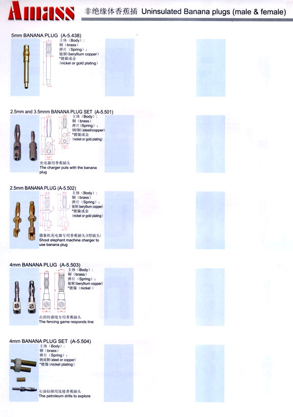 本公司專業(yè)生產(chǎn)各類香蕉插頭,香蕉插座,接線柱,電瓶夾,鱷魚夾,測試導(dǎo)線,測試筆等。產(chǎn)品分2mm/2.5mm/3mm/3.5mm/4mm五大系列,百余種款式, 各種香蕉插廣泛用于儀器、儀表、電力測試、教學(xué)、玩具,視聽設(shè)備、醫(yī)療儀器,保健產(chǎn)品等領(lǐng)域。公司技術(shù)力量雄厚,生產(chǎn)工藝先進,產(chǎn)品遠銷港、臺、歐美,并與飛利浦等國際品牌配套。公司本著精益求精的理念,歡迎新老客戶光臨。 我們擁有資深的工程師和豐富的電子產(chǎn)品銷售經(jīng)驗,專業(yè)生產(chǎn)各類電子接插件產(chǎn)品。 香蕉插頭,香蕉插座,電瓶夾,鱷魚夾等品種齊全、 質(zhì)量可靠,致力服務(wù)于通訊、數(shù)據(jù)通信、消費類電子產(chǎn)品、計算機和計算機外圍設(shè)備以及工業(yè)應(yīng)用等領(lǐng)域,能給客戶提供全面采購解決方案。 我們秉承穩(wěn)健作風(fēng)、誠實經(jīng)營、合理價格、完善服務(wù)的宗旨,在全體客戶的支持下,公司不斷創(chuàng)新進取,業(yè)績蒸蒸日上,已與數(shù)十家電子零件制造商及其分支機構(gòu)建立密切合作關(guān)系,在國內(nèi)擁有數(shù)百家固定客戶。